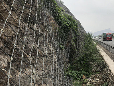 作用原理上類似于噴錨和土釘墻等面層護坡體系,但因其柔性特征能使系統將局部集中荷載向四周均材質:鋼絲繩網、普通鋼絲格柵(常稱鐵絲格柵)和TECCO高強度鋼絲格柵勻傳遞以充分發揮整個系統的防護能力,即局部受載,整體作用,從而使系統能承受較大的荷載并降低單根錨桿的錨固力要求。